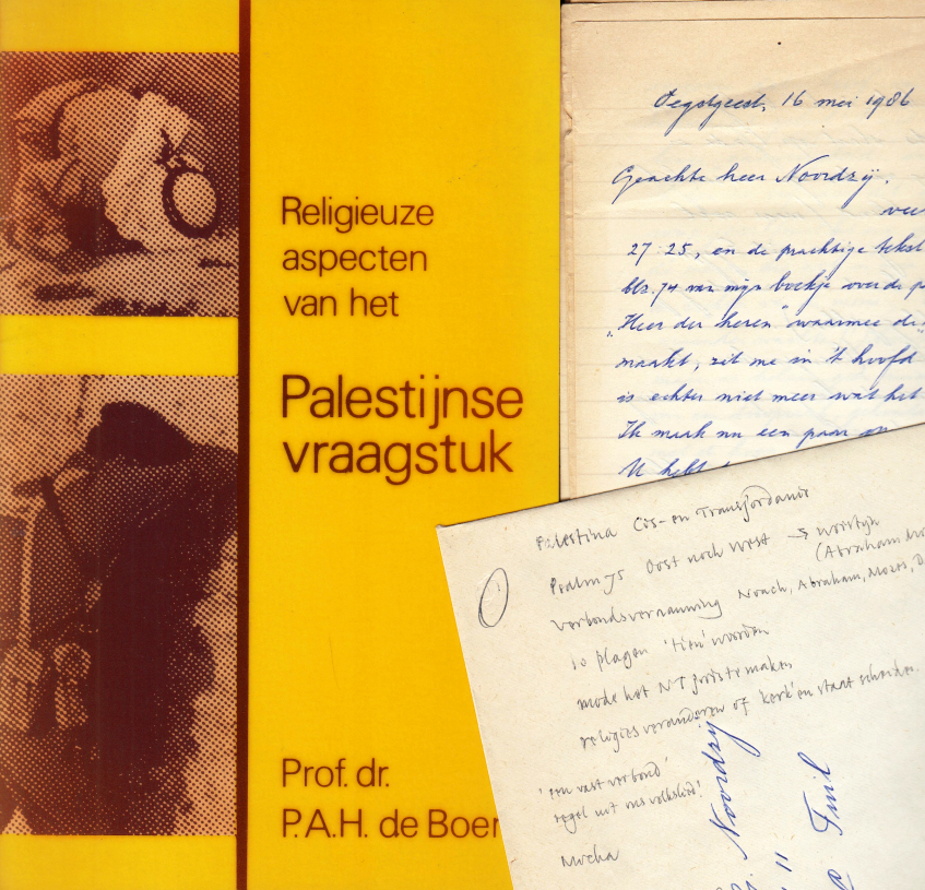 * Met ‘v.d.s.’ en enkele handgeschreven correcties. Met inliggend twee uitvoerige, doorwrochte, handgeschreven en gesigneerde brieven (ruim vier kantjes) van de auteur aan Gerrit Noordzij, plus een envelop waarop Noordzij enkele korte notities schreef, wellicht voor een antwoord op de eerste brief van 10 mei 1986. De tweede brief, van 16 mei 1986, is daar een zeer uitvoerige en gedetailleerde reactie op. De brieven gaan meer over het Oude Testament, maar het boekje over de situatie van Palestina anno 1983 en hoe het zo gekomen is. P.A.H. de Boer was van 1938-1978 hoogleraar in de Godgeleerdheid met betrekking tot het Oude Testament aan de universiteit van Leiden.