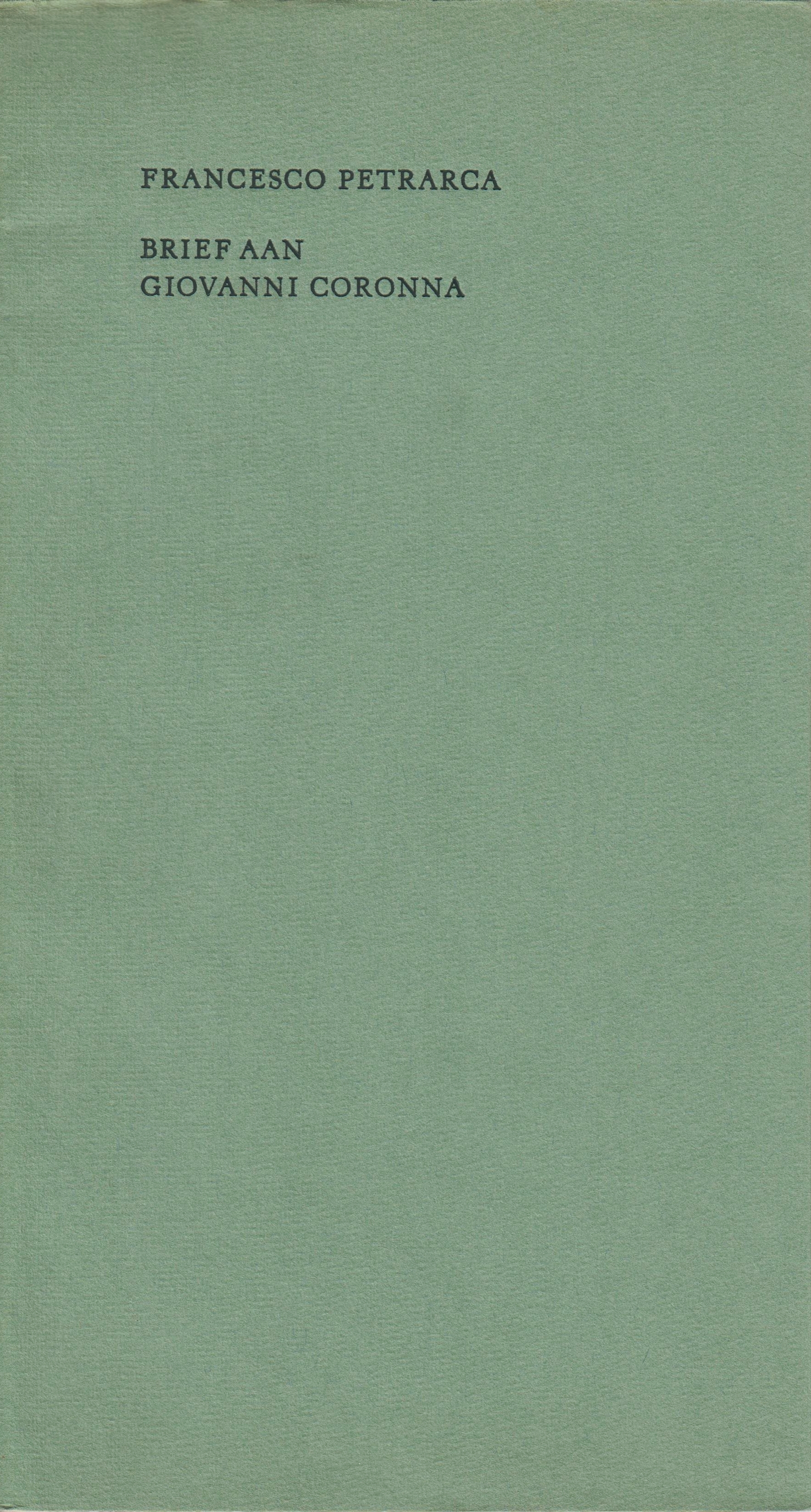 23. (LEOPOLD, J.H. (vertaling)). PETRARCA Brief aan Giovanni Coronna. Vertaald door J.H. Leopold. Sonnega, Regulierenpers, 1989. Ingenaaid met omslag. 16 p. Met de hand gezet uit de Horley en gedrukt in groen en zwart (op Hahnemühle) in een oplage van 75 genummerde exemplaren.