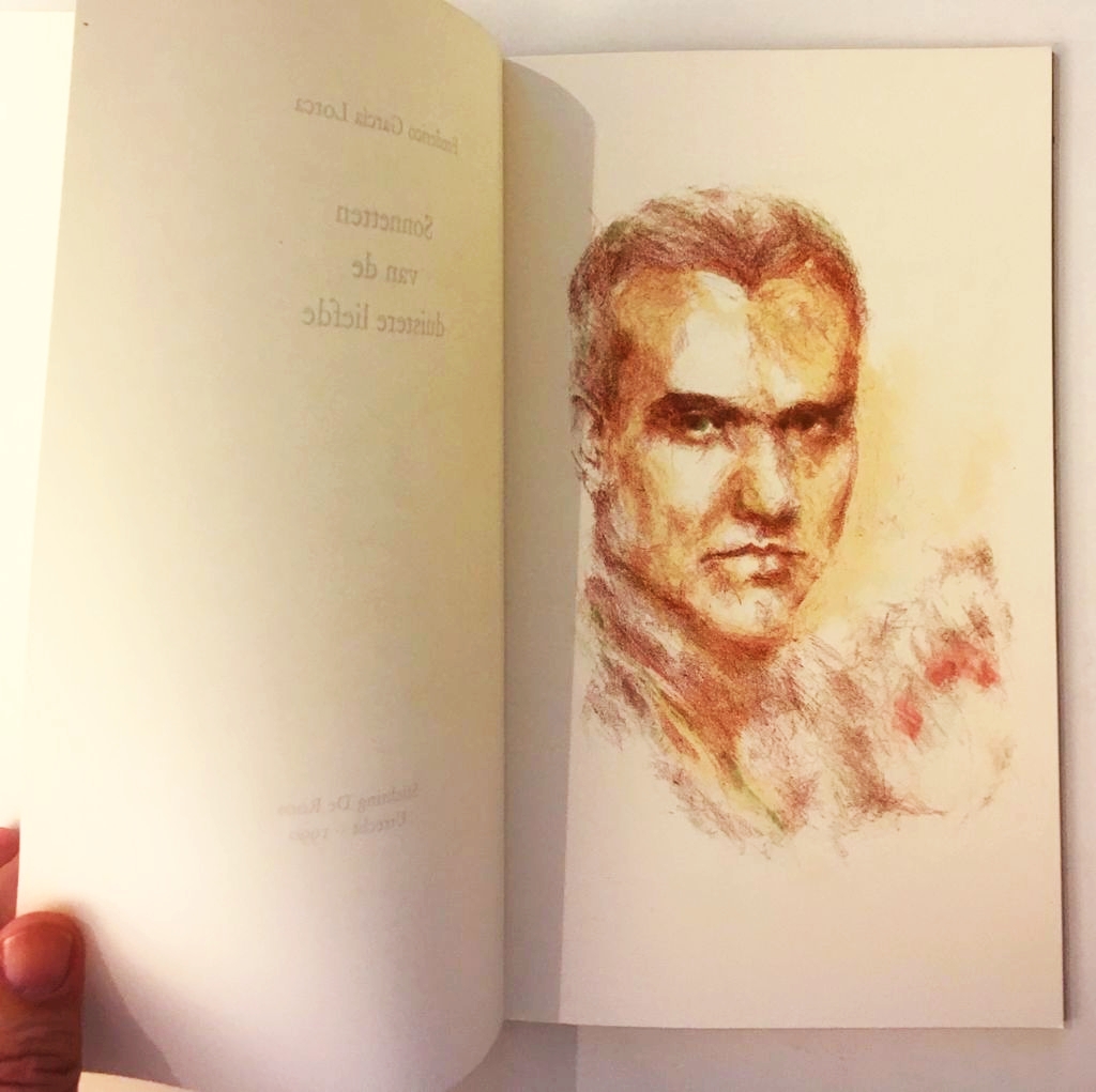 12. GARCIA LORCA, Federico Sonnetten van de duistere liefde. (Tweetalige editie, vertaald uit het Spaans en van een verantwoording voorzien door Francine Mendelaar. Met 7 originele litho’s van Chris Buursen). Utrecht, Stichting De Roos, 1990. Ingenaaid met omslag. 48 p. Band en typografie Ben Hosman. Gezet uit de Garamond en gedrukt door Geuze in paars en zwart op Simili Japon in een oplage van 175 genummerde exemplaren. Fraai en gaaf.