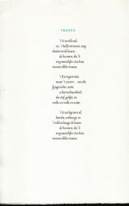 17. GEZELLE, Guido Tranen. Lacrimae. (Met een vertaling in het Latijn door Paul Claes). (Sonnega, Regulierenpers, 1990). Vouwblad in omslag. Gezet uit de Romanée en gedrukt in blauwgroen en zwart in een oplage van 70 exemplaren.