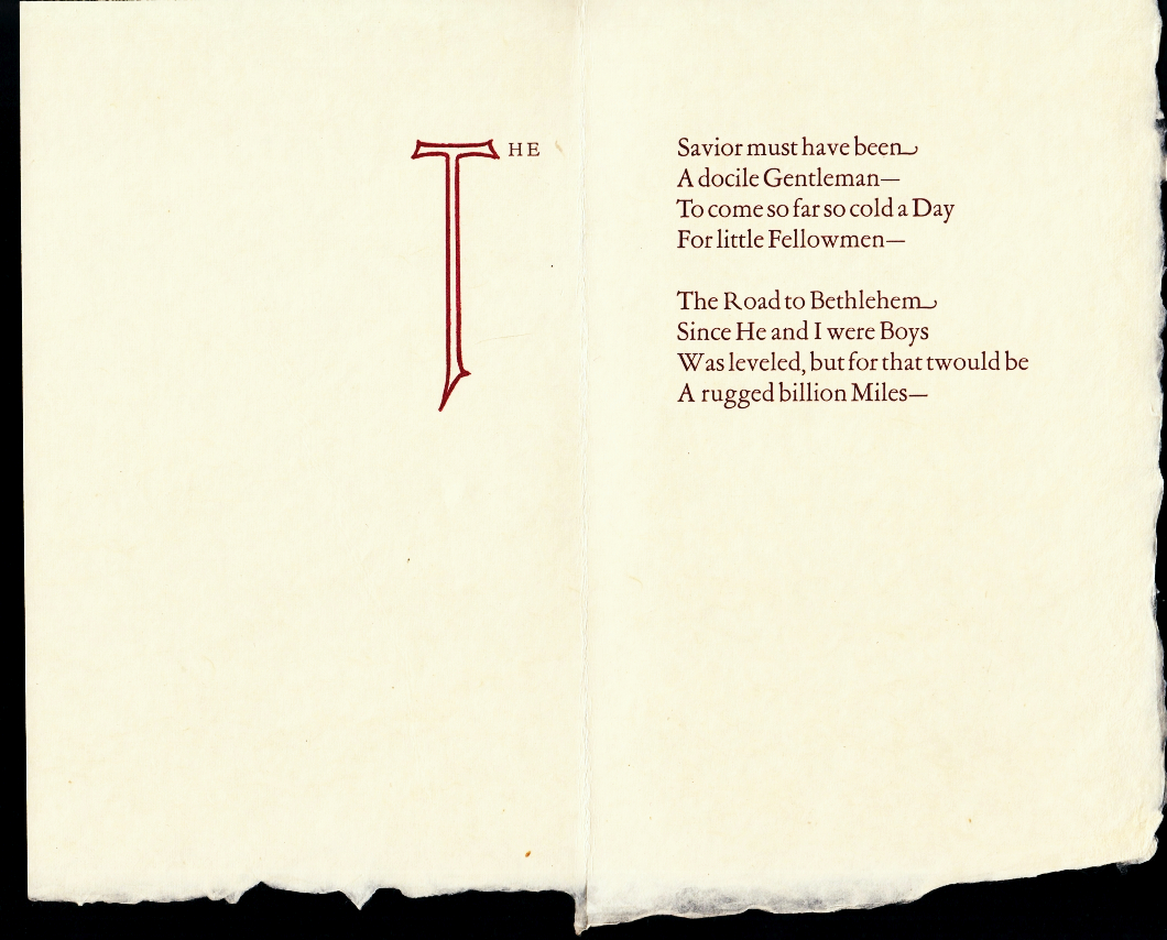 * Geweldig gedicht van Emily Dickinson, schitterend in bordeauxrood en bruin op Keizerlijk Japans papier gedrukt voor de Kerst. Van deze uitgave bestaan drie varianten. Dit exemplaar heeft een uitgevuld colofon, waaronder gedrukt ‘Regulierenpers’. De Regulieren 29/1987.
