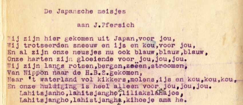 * Dé verzamelbundel van de verzen van Charivarius, die wekelijks in het opinieweekblad De Groene Amsterdammer verschenen. Vaak over taal en over allerlei Hollandse gewoonten en nieuwigheden (zoals voetbal), maar ook met bittere commentaren over de Eerste Wereldoorlog. Met een opdracht van Charivarius (pseudoniem van Gerard Nolst Trenité) onder zijn tweede achternaam ‘Trenité’ aan Jack Pfersich, gedateerd 22-10-’27. Achterin is een origineel pasfotootje van de schrijver geplakt met daaronder geschreven de dag van zijn overlijden. Ook met enkele typoscripten van gedichten van Charivarius, het eerste ‘Aan J. Pfersich’, ‘Voor ’t moois dat ik ontvangen heb/ veel dank. Hierbij mijn tolk./ Volg Naso’s goden, en herschep/ Prins Albert in een wolk.’ Het tweede is ook gericht aan Pfersich: ‘De Japansche meisjes’. Een los typoscript ligt erbij, ‘Kleengedicht van kleengedachte’, een knipsel, een prospectus en een getypte brief van ‘Chariv’ op de achterkant van een brief uit 1941 aan Charivarius. Daaronder een notitie in potlood van Pfersich, die tekenleraar was aan het Haarlemse Stedelijk Gymnasium en net als Charivarius zeer actief in het amateurtoneel in die stad.