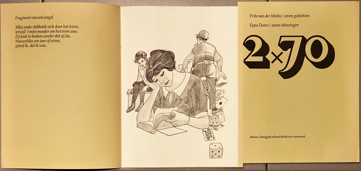 10. CARMIGGELT, Simon, & Frits van der MOLEN & Eppo DOEVE 2 x 70. Frits van der Molen-zeven gedichten. Eppo Doeve-zeven tekeningen. Amsterdam, Art Editions & Productions, 1978. 33 x 24 cm. Groot portfolio met zeven omslagen van getint Velasques-papier met elk zeven gedichten plus een illustratie op zwaar wit Rivespapier, voorafgegaan door een idem met inliggend de inleiding van Carmiggelt in facsimile van het handschrift (3 pagina’s) plus het colofon. Gedrukt in 140 genummerde exemplaren + enkele H.C. voor de medewerkers. Enkele kleine vlekjes op de buitenkant.