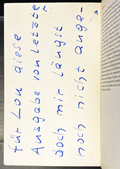 * Krachtdadige, fantastische handgeschreven opdracht van de auteur, geschreven in brede blauwe letters die zich uitstrekken over alle vier de blanco binnenkanten van de omslagen, aan zijn collega Lou Lichtveld (Albert Helman): ‘Für Lou diese Ausgabe von letzter, doch mir längst noch nicht ange/storbener Hand, womit es seine Weile haben möge (…) Vigo x/ 19/20 XI . 1971’. Met Lichtveld onderhield Thelen sinds 1934 een innige vriendschap.