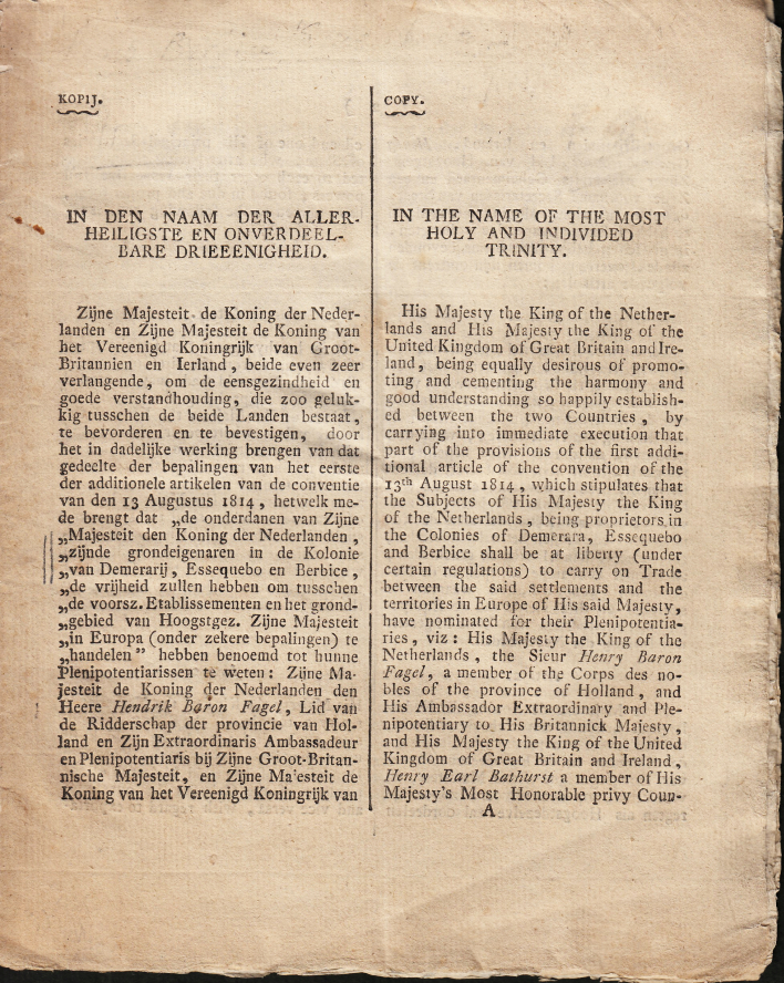 2. (BERBICE). H. FAGEL, [Henry] BATHURST & A.W.C. DE NAGELL In den Naam der Allerheiligste en Onverdeelbare Drieeenigheid. Zijne Majesteit de Koning der Nederlanden en Zijne Majesteit de Koning van het Vereenigd Koningrijk van Groot-Brittannien en Ierland / In the Name of the Most Holy and Individed Trinity. His Majesty the King of the Netherlands and His Majesty the King of the United Kingdom of Great Britain and Ireland. Kopij / Copy. (Met betrekking tot de Colonie de Berbice). Den Haag, 16 oktober 1815. Drie in elkaar gevouwen bladen. 12 p. In twee kolommen gedrukt, de linker in het Nederlands, de rechter in het Engels. Vage vlek in het midden, wat stoffig hier en daar, enige randkreukjes. Wat potloodstreepjes en uitgegumde notities zichtbaar.