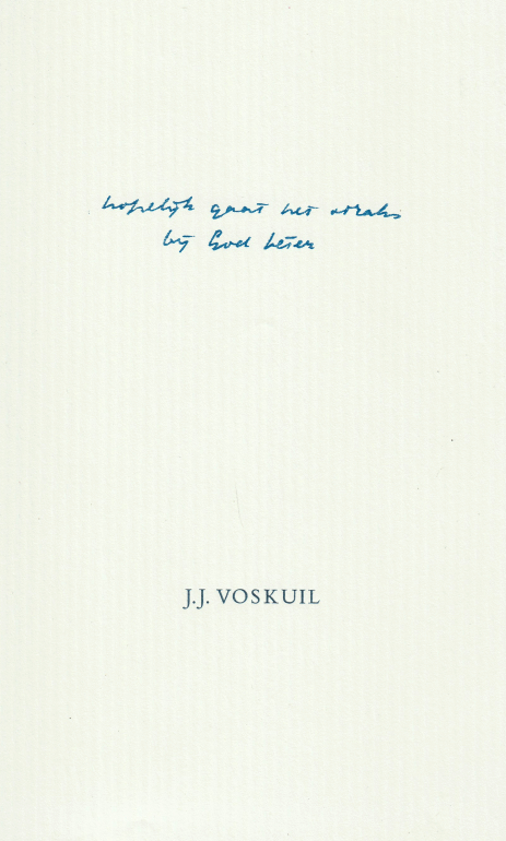 48. VOSKUIL, J.J. Hopelijk gaat het straks bij God beter. Vier brieven aan Henk Romijn Meijer. (Met een nawoord door Gerben Wynia). Haarlem, De Hof van Jan, 2012. Cahiersteek met stofomslag. (16) p. Gezet uit de Bembo en gedrukt in een oplage van 100 exemplaren. 1e druk.