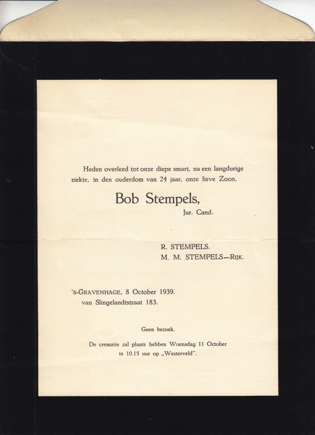 Een dag na het overlijden schrijft zijn vader aan Lekkerkerker ‘Mijn zoon Bob Stempels is helaas overleden op 8 October 1939. In november aanstaande verschijnt een bundel van ca. 25 gedichten getiteld “Klein Verlies”. (…) Bij verschijnen van uw uitgave hopen wij dat u ons, zijn ouders, niet zult vergeten’. Voorts vraagt hij of Lekkerkerker de foto die de dichter had gestuurd kan terugsturen, ‘want het is zijn laatste foto’. Bijgevoegd is ook de rouwbrief, waaruit blijkt dat de crematie drie dagen na het overlijden plaatsvond, en een dankbetuiging van later datum. Schrijnend geheel.