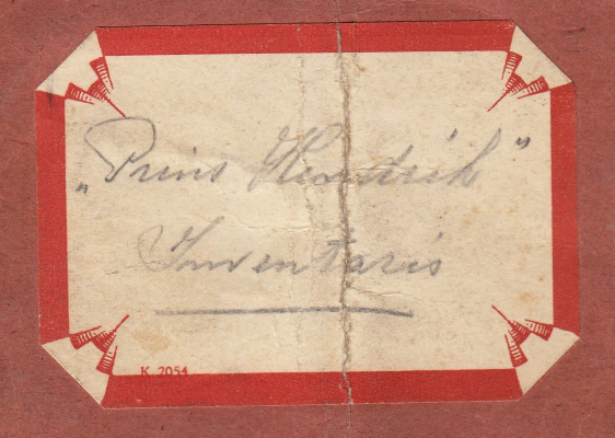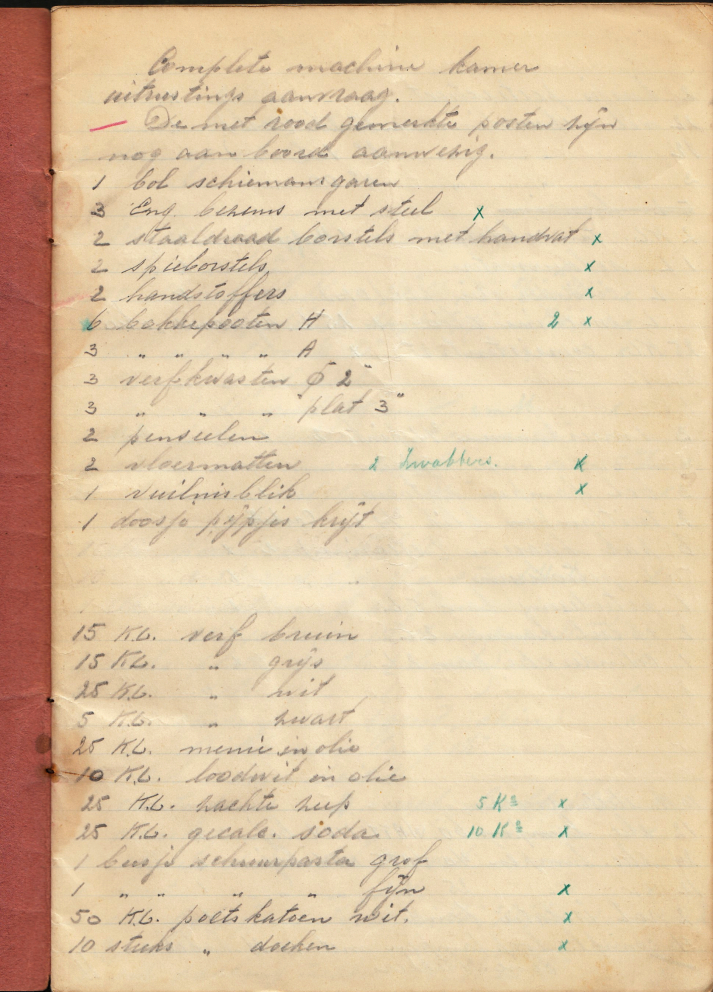 39. SCHEEPSINVENTARIS Handgeschreven inventaris van het schip Prins Hendrik. Schoolschrift met etiket dat blijkens K-nummer gedrukt is in Rotterdam tussen 1941 en 1946. Wellicht is het schrift beschreven in de tweede helft van de jaren veertig. (32) p., waarvan 26 beschreven met potlood, kleurpotlood en inkt. Verticale vouw. Gebruikssporen, maar het handschrift is uitstekend leesbaar.
