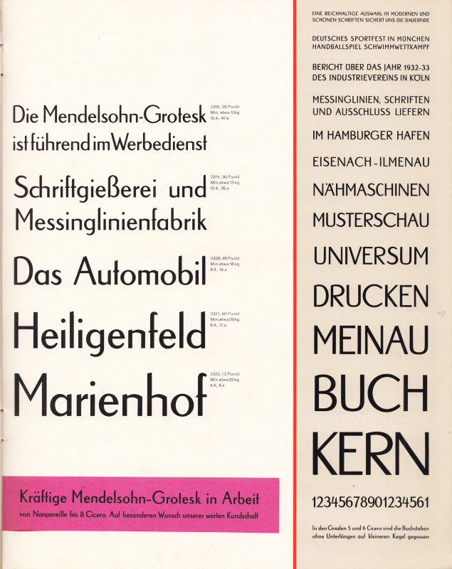 * Schitterende, evenwichtige en fris-moderne letterproef van de uit 1929 daterende Mendelsohn-Grotesk, met alleen voorbeelden van het gebruik van de letter, zonder alfabetten. Over de ontwerper is weinig bekend – verwar hem niet met Erich Mendelsohn of Georg Mendelssohn (met dubbele s).