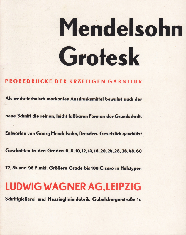 24. LUDWIG WAGNER AG, Schriftgiesserei und Messinglinienfabrik Mendelsohn Grotesk. Probedrucke der kräftigen Garnitur. (Letterproef). Leipzig, Ludwig Wagner AG, (1931). 26 x 20 cm. Geniet zonder omslag, zoals uitgegeven. 8 p. Gedrukt in rood en zwart. Met afbeeldingen en moderne voorbeelden van de Mendelsohn-Grotesk in zijn vette vorm. Kleine colofonregel achterin vermeldt: ‘384 11.31 3T’ ofwel, dit blad verscheen in november 1931 in 3000 exemplaren. Uitstekende staat.