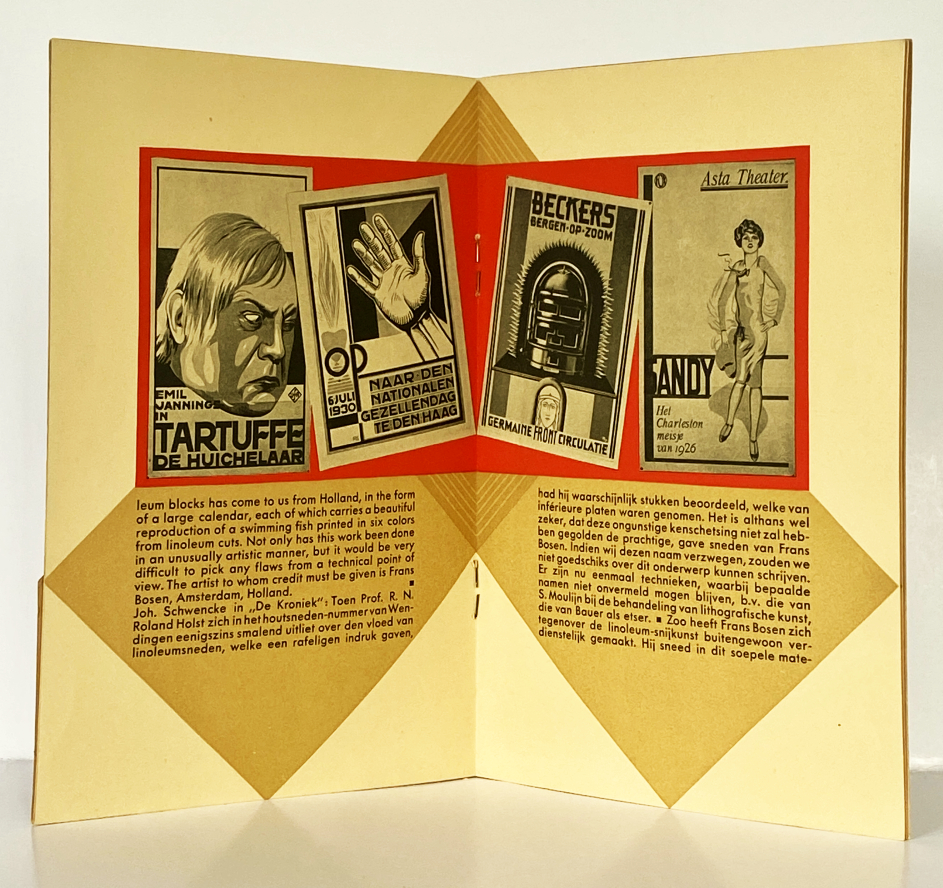 * Verbazend drukwerk, dit heldere boekje over illustratiedruk in linosnede, een techniek die ontwerper Frans Bosen (1891-1949) als geen ander beheerste. Met veel afbeeldingen waarin Bosens virtuoze linosneden worden geshowd (vervaardigd tussen 1924 en 1934) in opvallende ruitenvormgeving. Ook ‘diplinodruk’ wordt genoemd, een combinatie van diepdruk en lino, waar we verder helaas niets meer van vernemen.