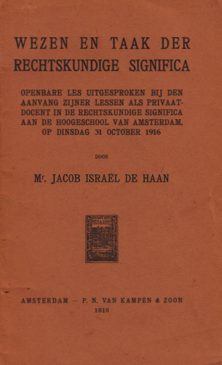 16. HAAN, Jacob Israël de Wezen en taak der rechtskundige significa. Openbare les uitgesproken bij den aanvang zijner lessen als privaatdocent in de rechtskundige significa aan de Hoogeschool van Amsterdam, op dinsdag 31 October 1916. Amsterdam, Van Kampen, 1916. Geniet. 32 p. 1e druk. Lichte gebruikssporen: enkele potloodstreepjes in de kantlijn.