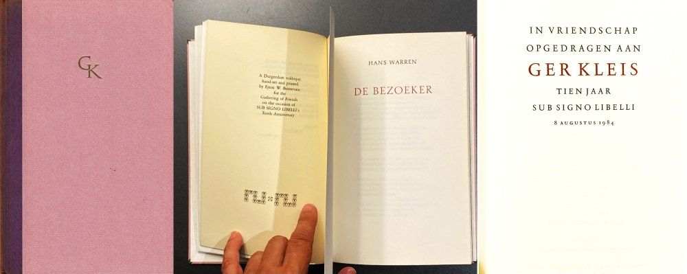 17. (SUB SIGNO LIBELLI). BÜCH, Boudewijn, Gerrit KOMRIJ, Hans WARREN e.a. In vriendschap opgedragen aan Ger Kleis. Tien jaar Sub Signo Libelli 8 augustus 1984. Halfmarokijn (Binderij Phoenix; rug als vrijwel altijd verschoten). Gedrukt door elf verschillende drukkers in een oplage van 52 genummerde exemplaren. Zeer lichte roestvlekjes op de kop.