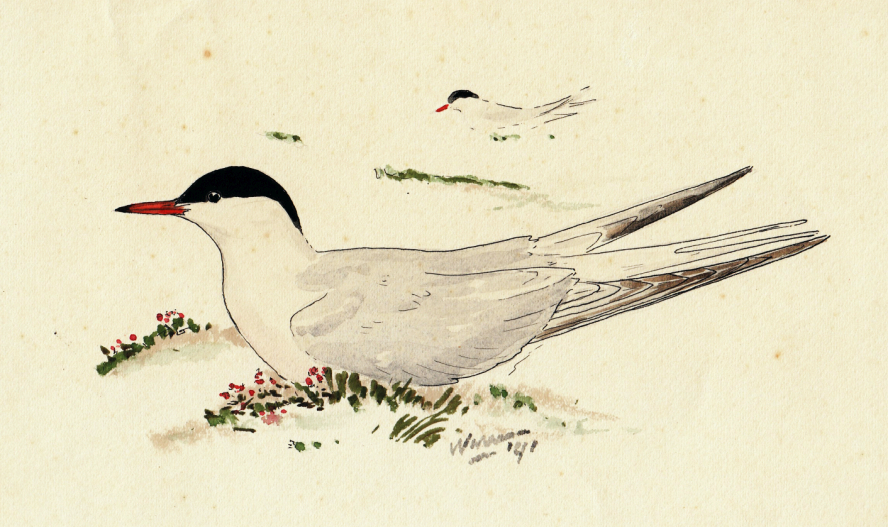 * Een van de originele vogeltekeningen van Hans Warren uit de jaren 1939-1942: een dwergstern is een kleine meeuw.