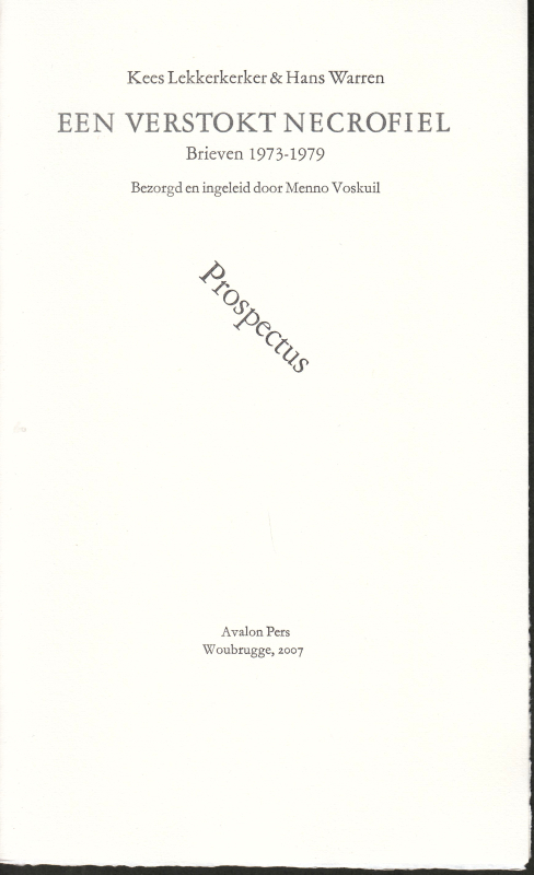 16. LEKKERKERKER, Kees, & Hans WARREN Een verstokt necrofiel. Brieven 1973-1979. Bezorgd en ingeleid door Menno Voskuil. Woubrugge, Avalon Pers, 2007. Ingenaaid met stofomslag en titeletiket. (52) p. Gezet uit de Garamond en met de hand gedrukt op Zerkall in grijs en zwart in een oplage van 90 genummerde exemplaren. 1e druk.