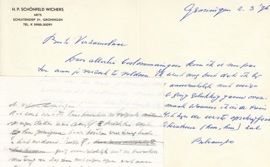 * 1. Handgeschreven brief aan ‘Beste Verzamelaar’. 13,7 x 21,7 cm. Op voorgedrukt briefpapier van ‘Mr. H. P. Schönfeld Wichers/ Arts’. Eén blad. Alleen recto. Gesigneerd ‘Belcampo’ en gedateerd ‘Groningen 2.3.’76’. 8 regels tekst.
