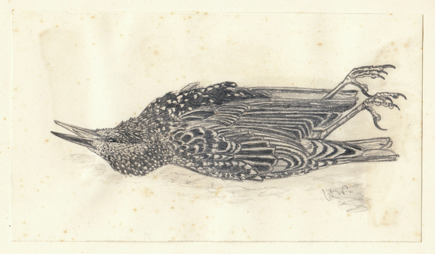 3. WARREN, Hans Dode spreeuw. 12,4 x 22,3 cm. Potlood. Gemonogrammeerd ‘H.W.’. Geplakt op een kartonnetje met gebruikssporen.