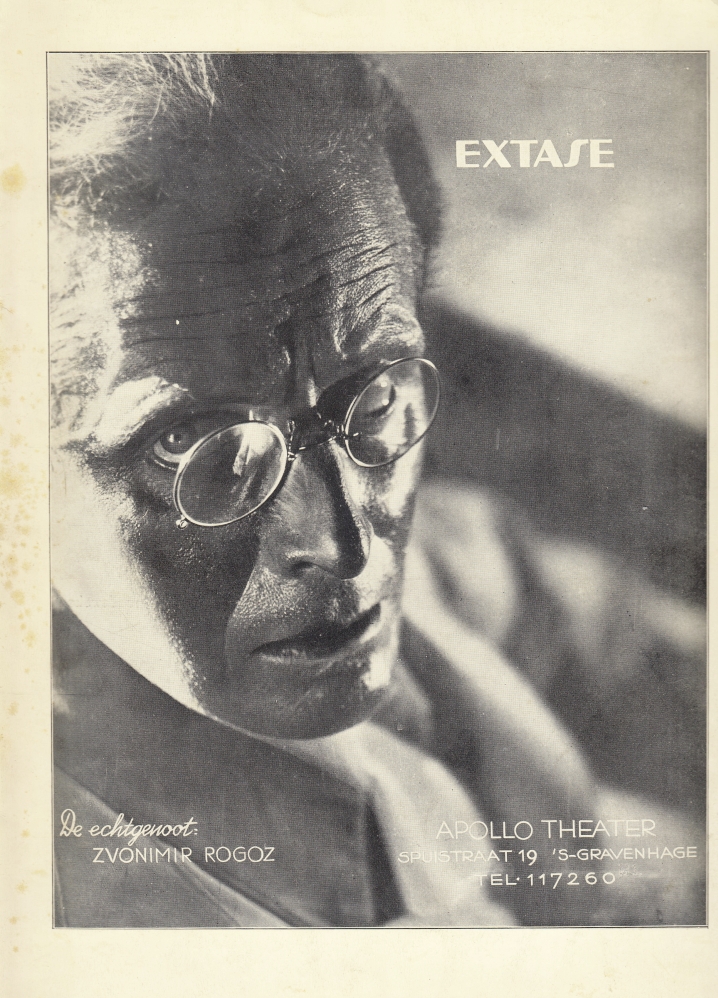 1. APOLLO THEATER Extase. Filmprogramma 20-26 October 1933. Den Haag, Apollo Theater, 1933. 30 x 23 cm. Geniet. (8; 4) p. Programmablad met grote, bijzonder mooie filmfoto’s, korte tekst en recensies. In inliggend blad het programma zelf, advertenties en korte inhoud van de film. Ook met twee contemporaine krantenknipsels. 1e druk. Gaaf. Voorop in de marge wat vlekjes.