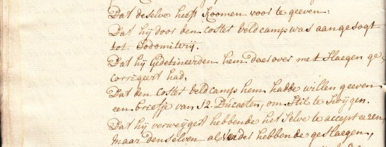 * Manuscript in mooi handschrift, het verslag van een krijgsraadzaak waarbij een officier Borkensteijn de bejaarde custos (koster) van de Broederkerk in Nijmegen ervan beschuldigde dat hij naar zijn broek had gewezen om hem tot sodomie te verleiden. Uiteindelijk werden de officier en een medeplichtige gedegradeerd, ontslagen uit dienst en hun sabels gebroken, alvorens ze aan een civiele rechtbank werden overgedragen. De koster werd van alle blaam gezuiverd en vrijgelaten, hij kreeg zijn geld terug. Dit uitgebreide verslag van 42 handgeschreven pagina’s komt grotendeels overeen met een gedrukt artikel in de Nieuwe Nederlandsche Jaerboeken van Martinus Stuart (Deel VII/2 (augustus 1753), p. 699-724).