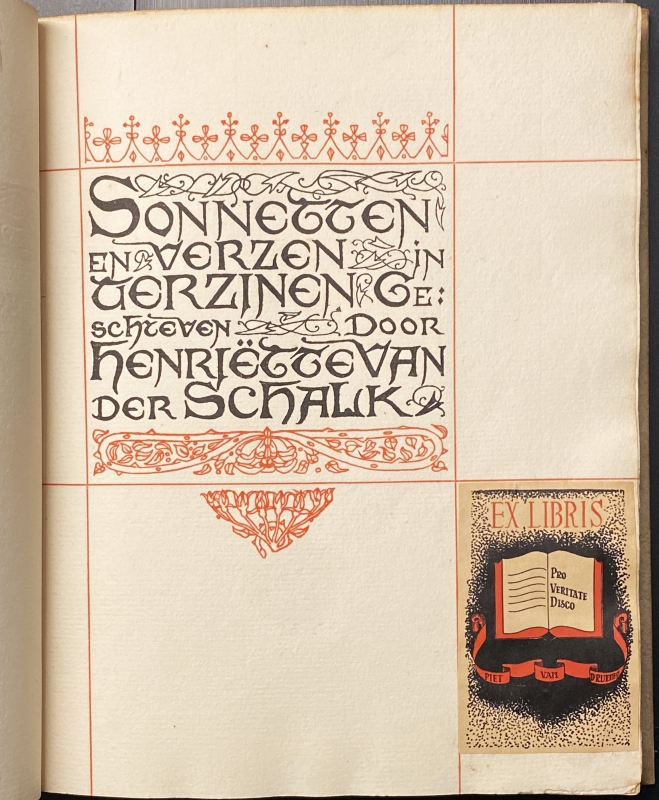 28. ROLAND HOLST, Henriëtte (Als:) Henriëtte van der SCHALK Sonnetten en verzen in terzinen geschreven. (Amsterdam, Scheltema en Holkema, 1895). Halflinnen. (18), 128 p. Gedrukt in rood en zwart door Joh. Enschedé. Boekversiering door R.N. ROLAND HOLST. 1e druk. Debuut. Platten iets verkleurd, schutbladen heel licht verbruind. Aardig exlibris op binnenzijde van de boekband van S.J. Chabot uit Heemstede (1880-1951), die rond 1925 directeur was van de Haarlemse schouwburg. En een exlibris van Piet van Druenen op de titelpagina. Toch een bovengemiddeld goed exemplaar.