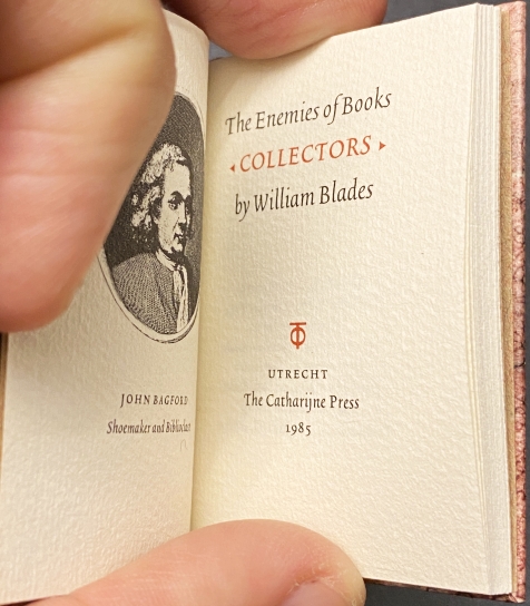6. (CATHARIJNE PRESS). BLADES, William The Enemies of Books: Collectors. Utrecht, The Catharijne Press, 1985. 6,3 x 4,3 cm. Karton overtrokken met zetmeelpapier met etiket op voorplat (Luce Thürkôw). 40 p. Gezet uit de 5-punts Trinité Medium Condensed 2 en gedrukt in twee kleuren op Hahnemühle Ingres in een oplage van 250 genummerde exemplaren. Typografie Bram de Does.