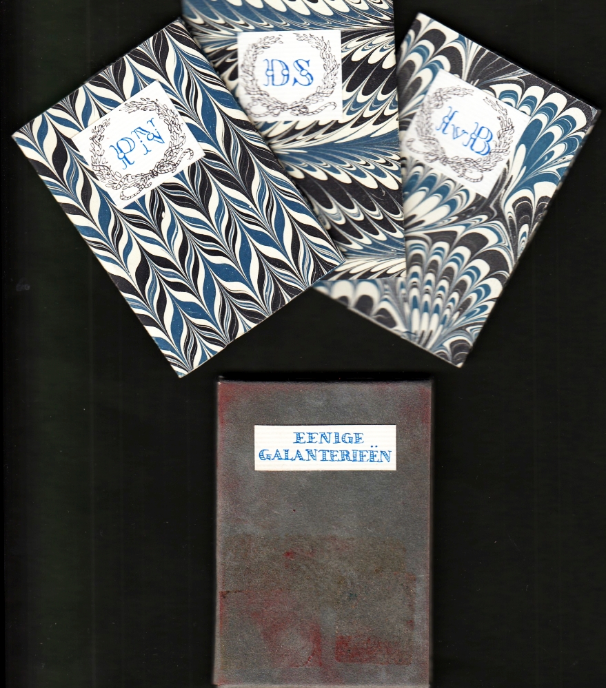 5. BROEKHUIZEN, Johan van, Pieter NIEUWLAND & Dirk SMITS Eenige galanterieën. (Drie miniboekjes in foedraal). Utrecht, De Utrechtsche, 1980. 75 x 53 mm. Drie geniete boekjes met marmeromslagje, samen in fluweelbekleed foedraal. Elk boekje bevat een frontispice en enkele galante gedichten uit de 18e eeuw. Gedrukt in ruim 300 genummerde exemplaren. 1e uitgave. Het foedraal heeft wat rode vlekken opgelopen (lipstick?).