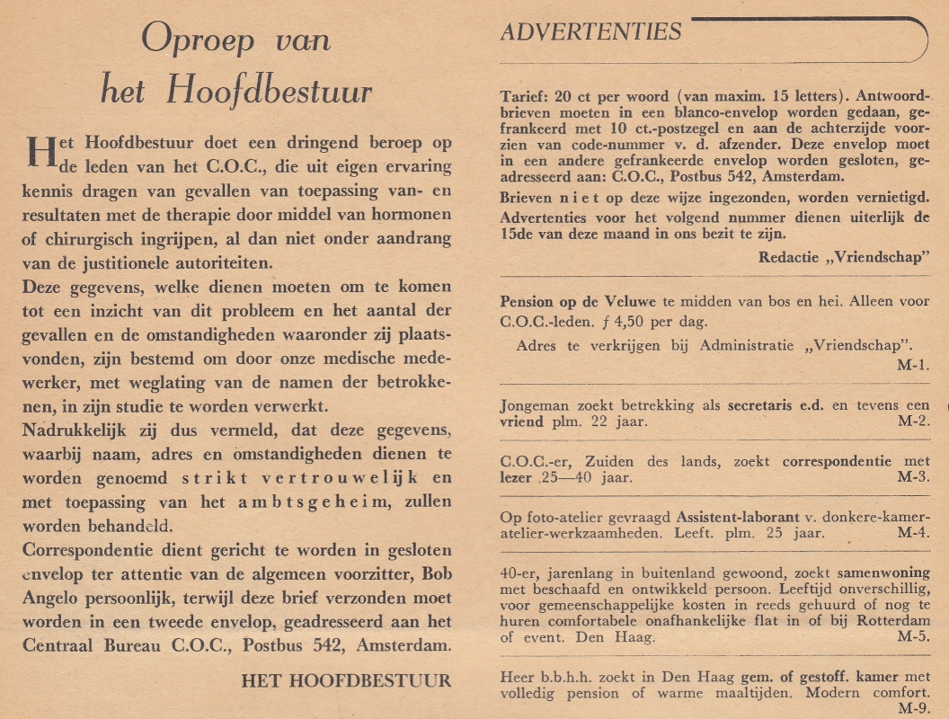 * Uiterst zeldzame, vroege jaargang van dit maandblad voor homoseksuelen, met veel informatie over het C.O.C. en veel fraaie foto’s en tekeningen (o.a. van Aristide Maillol, ‘Philip, Chicago’, Paul Cadmus, Siegfried, Michelangelo, Bernardino del Boca di Villaregia, Mario de Graaf en Godfried de Groot). Ook met de ‘C.O.C.Tail’: de agenda van de verschillende afdelingen (Amsterdam, Den Haag, Rotterdam, Groningen en Utrecht) en met heel beschaafde advertenties. Onder meer over André Gide, C. van Emde Boas, Jean Cocteau, het Internationaal Congres, Simon Vestdijk, 50 jaar homogeschiedenis, het vijfjarig lustrum met vele felicitaties en talloze andere grote en kleine artikelen met veel aandoenlijke inkijkjes in het moeizame, maar met sprankjes humor gedecoreerde leven van homoseksuelen anno 1951.