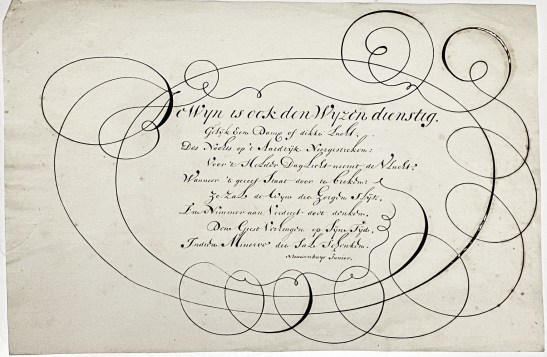 19. KALLIGRAFIE De wijn is ook den Wijzen dienstig. (Origineel handschrift, eind 18e eeuw). Krullig gekalligrafeerd vers van negen regels, met daaronder de naam ‘Nieuwenhuys Junior’. Inkt wat uitgebeten, papier in goede staat.