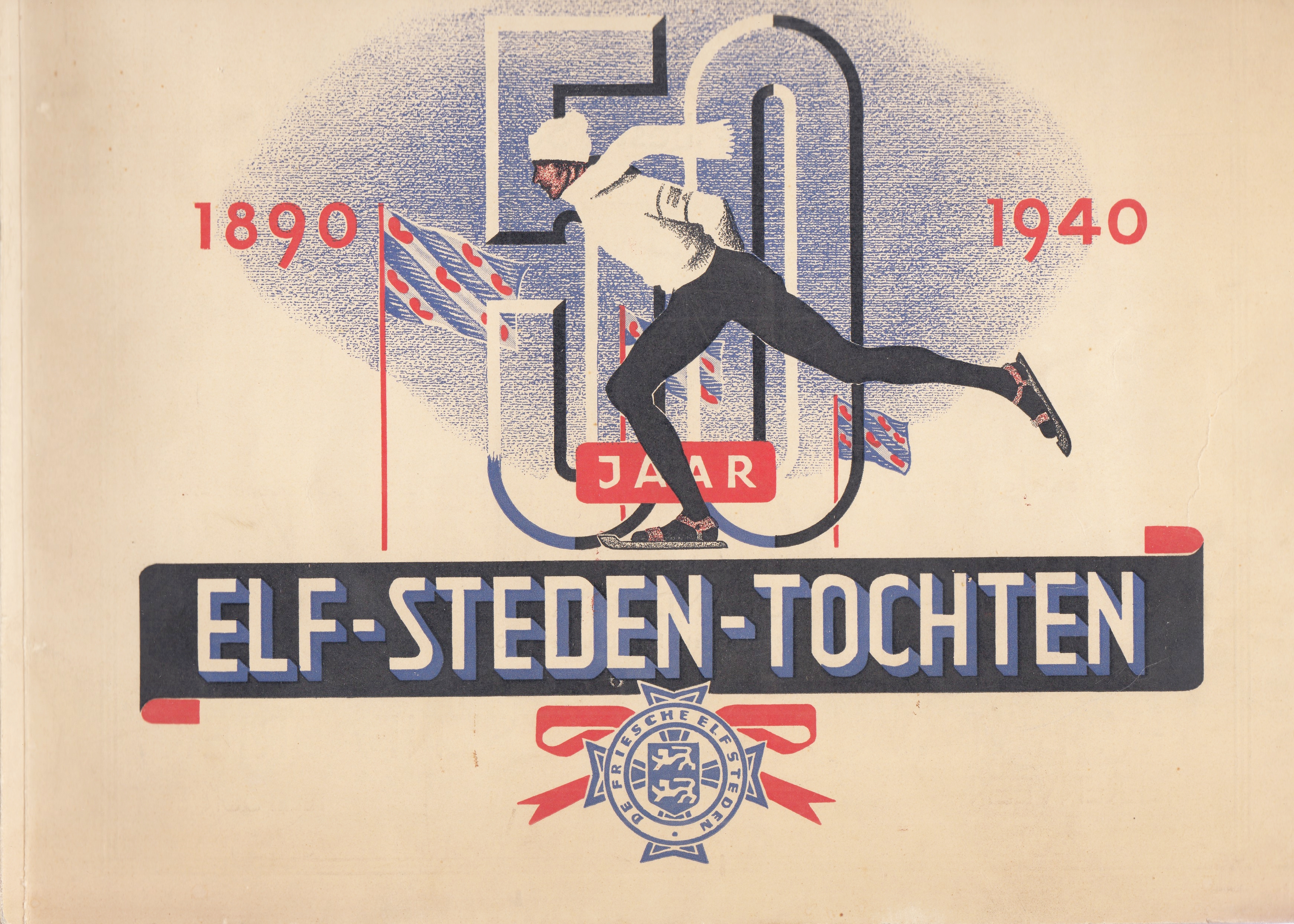 13. (ELFSTEDENTOCHT). WIERSMA, J.P. Vijftig jaar Elf-Steden-Tochten 1890-1940. Friesche schaatsensport en schaatsen-industrie. Leeuwarden, Realta, 1941. Liggend formaat 24 x 32 cm. Ingenaaid. 136 p. Talloze foto’s en veel advertenties. 1e druk. Lichte ouderdomssporen, maar behoorlijk netjes.