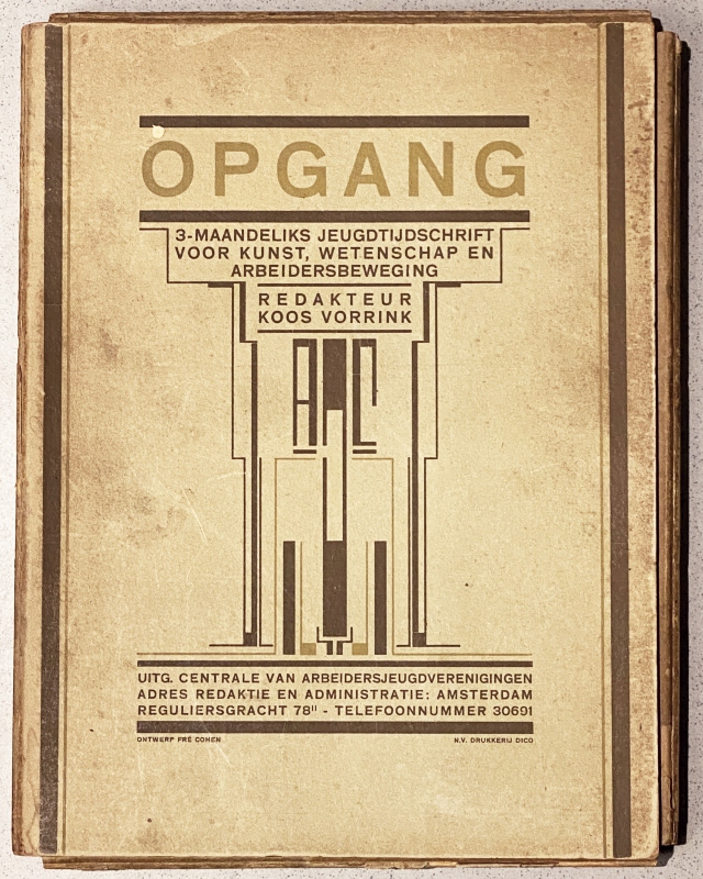 10. (COHEN, Fré) Opgang. Jaargang 3 en 4 compleet in 4 nummers elk, samen in een kartonnen bewaarband. Plus drie losse nummers. Amsterdam, Centrale van Arbeidersjeugdvereenigingen, 1924-1925. 31 x 25 cm. Compleet met de omslagen. 24 p. per nummer. Geniet. Geïllustreerd. 1e druk. Band wat dof. Scheurtje in een omslag, maar de kwetsbare tijdschriften zijn in goede staat.