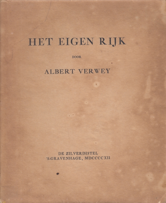 40. (ZILVERDISTEL). VERWEY, Albert Het eigen rijk. Den Haag, De Zilverdistel, 1912. Ingenaaid met perkaline omslag. (4), 148 p. Gedrukt door Enschedé in een oplage van 100 genummerde exemplaren. 1e druk. Perkaline (als meestal) niet puntgaaf: gaatjes in de rug, vlekken op voor- en achterkant.