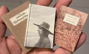 7. (CATHARIJNE PRESS). IRVING, Washington Rip Van Winkle. (Met litho’s van Henk van der Haar). Utrecht, The Catharijne Press, 1987. 6,5 x 4,4 cm. Geïllustreerd karton (Luce Thürkôw). 54 p. Gezet uit de 5-punts Trinité Roman Condensed 2 en gedrukt op Delphi in een oplage van 150 genummerde exemplaren. Typografie Bram de Does.