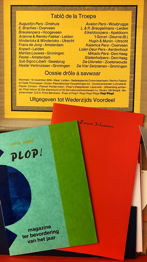 10. DRUKWERK IN DE MARGE, STICHTING Plop of Flop? Doos ter bevordering van de veertigste verjaardag van de Jongenheer Ernst Boissevain. Leiden, 2004. 22 x 34 x 6 cm. 22 uitgaven in een door Lonneke N. versierde doos. Vervaardigd in een oplage van 40 dozen.