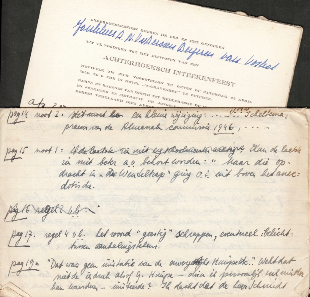 * Levensbeschrijving van deze exponentiële Leidse student met veel foto’s, gevolgd door honderd pagina’s bloemlezing van gedichten, opstellen en studentikoze herinneringen. Met voorin een opdracht (met onleesbare handtekening) aan A.N. baron van Aerssen Beyeren van Voshol (1922-1977). In het boek ligt een uitvoerig concept van een brief in handschrift van Van Aerssen aan de uitgever, met tientallen correcties en voorstellen voor tekstverbetering: vijf dichtbeschreven kantjes en een kaart met notities na afsluiting van het boek in april 1950. De aantekeningen in het boek verwijzen daarnaar. Ook met identificaties van personen die zonder naam voorkomen. Henri Schmidt Degener was een broer van de kunsthistoricus F. Schmidt Degener.