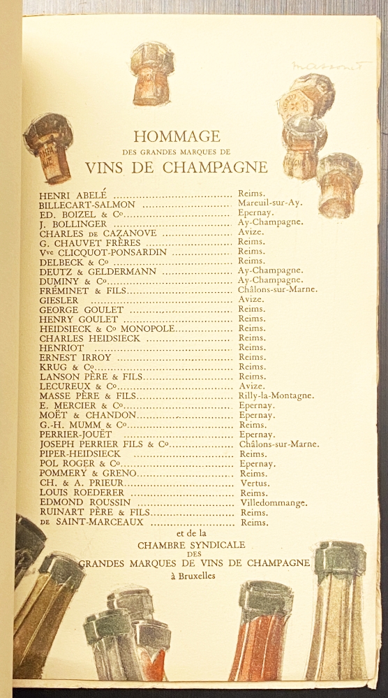 5. (CHAMPAGNE). Jacques BIEBUYCK (red.) & Armand MASSONET (ills.) Aux amateurs de grands vins de Champagne en Belgique. Brussel, J.E. Goossens, 1933. 19 x 14 cm. Genaaid met sierkoord. Blindstempel van champagnekurk op voorzijde. 32 p. Illustraties in kleuren van Armand Massonet met teksten van Jacques Biebuyck. 1e druk. Wat kreukjes.