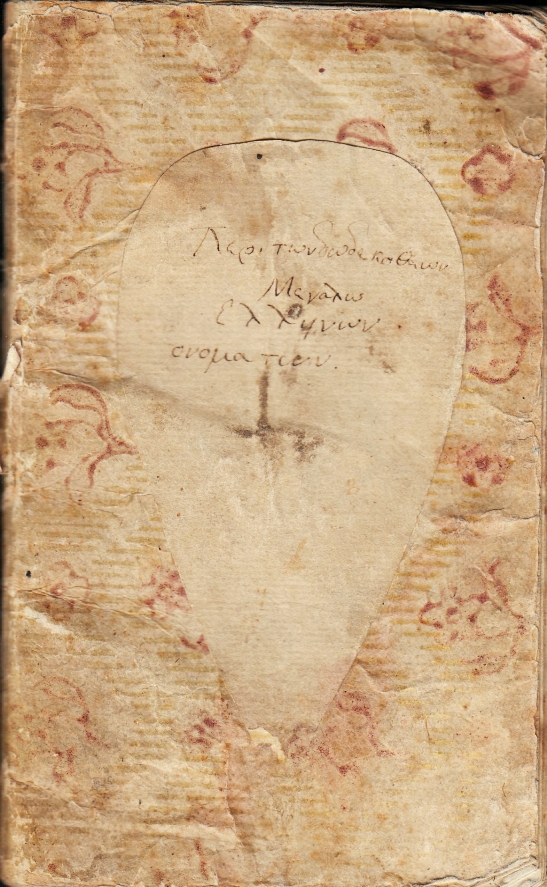 27. NOTITIEBOEKJE, 19e eeuw Peri tōn dōdeka theōn megalōn hellenōn onomatōn. ‘Over de namen van de twaalf grote Griekse Goden’. Zelfgemaakt notitieboekje (16 x 10 cm) uit ca. 1800 met gedecoreerd omslag en opgeplakt hartvormig etiket. Met touwtje genaaid. 28 + 10 gebruikte pagina’s. 12 bladzijden met tekeningen, alle in bruinachtige inkt. Aan de buitenkant wat slijtage, ezelsoortjes. Aan de voorkant gebruikt voor teksten in Grieks doorspekt met Latijn over de Olympische Goden. Ook met een aantal schetsmatige tekeningen van figuren, landschappen en gebouwen. Omgekeerd aan de achterkant vinden we tien pagina’s met Nederlandstalige potloodnotities over planten: talloze Latijnse plantnamen en aanduidingen wanneer planten in bloei geraken. Er staat een jaartal bij: 1920.