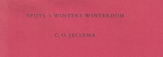 19. JELLEMA, C.O. Spijts ’s winters winterdom. Een essay over Eduard Mörike en een vertaling van Auf eine Christblume. (Wijhe, Hein Elferink, 1988). Ingenaaid in omslag. (32) p. Met de hand gezet uit de Bembo en gedrukt in rood en zwart op Zerkall-Bütten door Hein Elferink in een oplage van 85 op de pers genummerde exemplaren. 1e druk. Beetje vocht bovenaan voorzijde omslag,