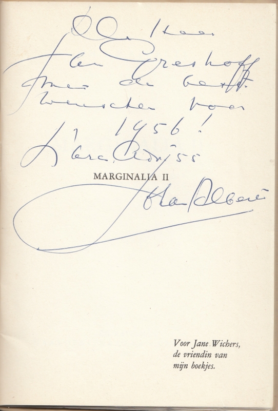 1. ALBERTS, Joh.C. Marginalia (&) Marginalia II. Den Haag, De Waterman, 1955. Geniet. 40; 56 p. 1e druk. Achterin deel I is een krantenknipsel geplakt.