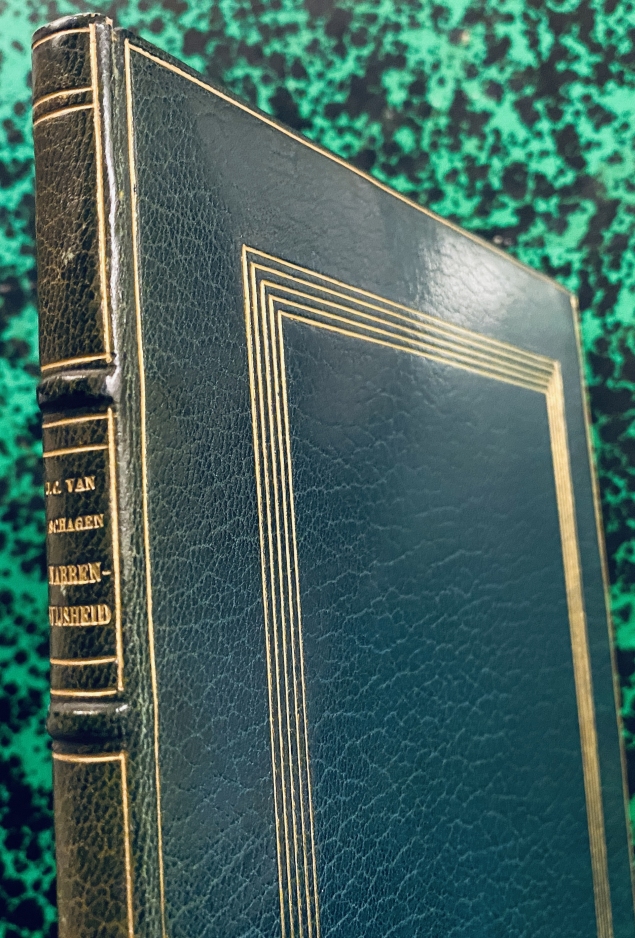37. (SAMBLANX, Ch. de). SCHAGEN, J.C. van Narrenwijsheid. (Met schitterende luxe-boekband van een belangrijke Brusselse boekbinder). Arnhem, Hijman, Stenfert Kroese en Van der Zande, 1925. Verguld heelleer (Ch. de Samblanx). Origineel omslag meegebonden. 32 p. Gedrukt door Joh. Enschedé in rood en zwart in een oplage van 160 exemplaren. Typografie en expressieve initialen van J. van KRIMPEN. 1e druk. In uitstekende conditie.
