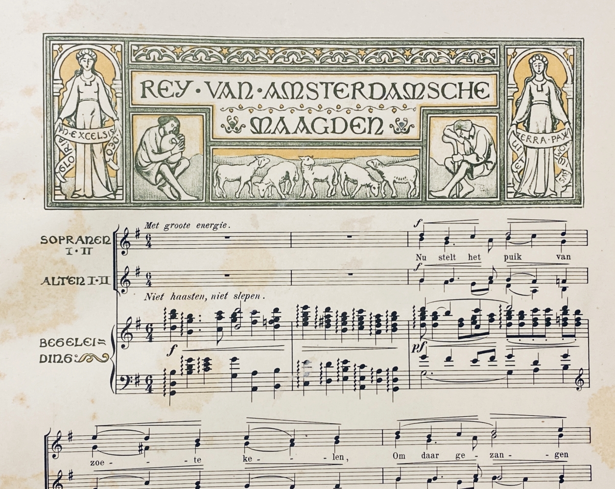 14. (DERKINDEREN, Antoon, BERLAGE, H.P., ZWEERS, Bernard, DIEPENBROCK, Alphons). VONDEL, Joost van den Gysbreght van Aemstel. D’ondergang van syn stad en syn ballingschap. Treurspel. Met inleiding van L. Simons, toneeldecoratieontwerpen van H.P. Berlage, muziek van Bern. Zweers [en Alphons Diepenbrock], boekversieringen van A.J. Derkinderen. Haarlem, Erven F. Bohn, 1893 [= 1894-1901]. Twee delen. 44 x 33 cm. Versierd linnen. 1e druk. Banden in prima conditie. Aan begin en eind van de boeken wat gelige roestvlekken.