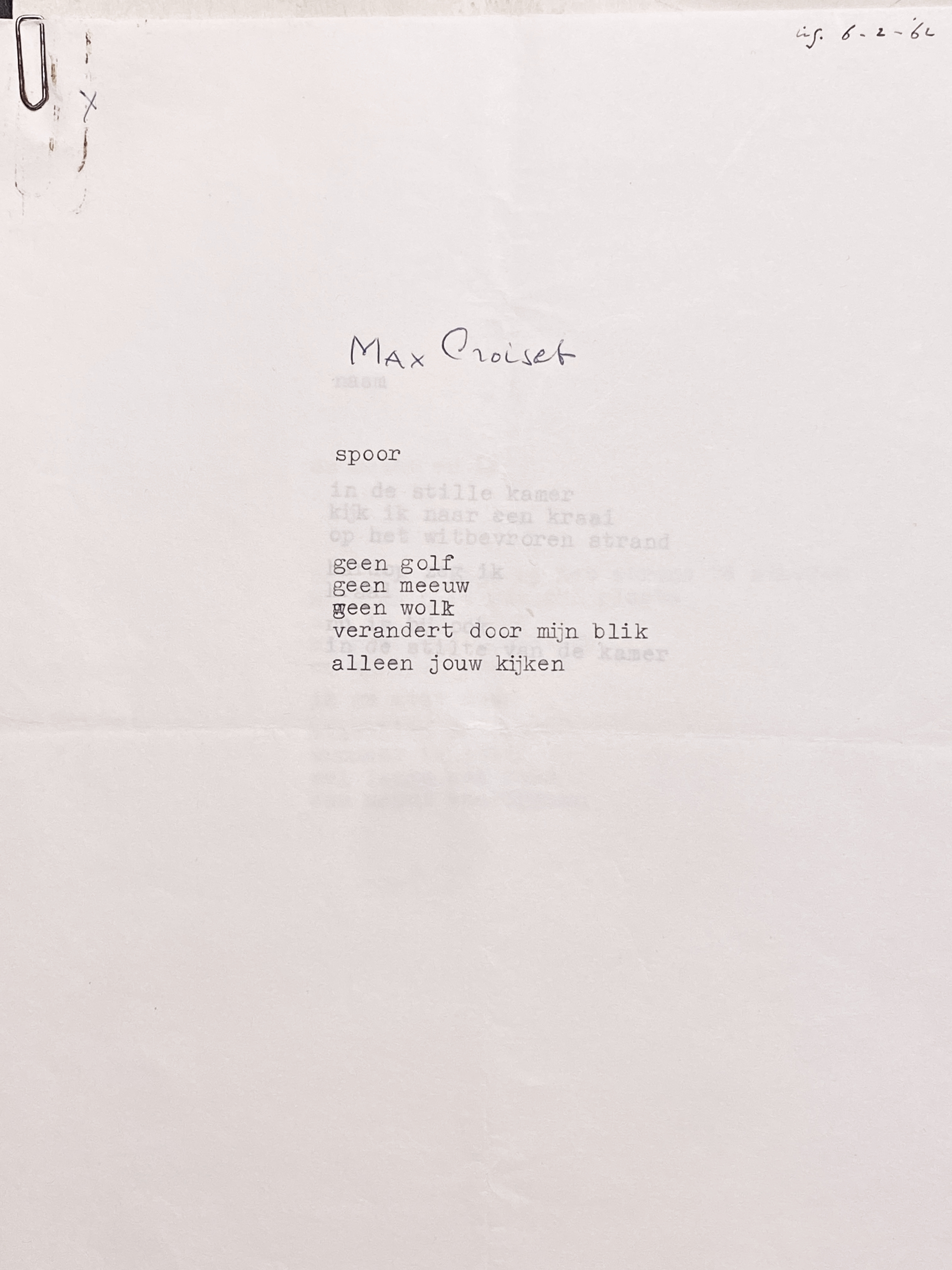 Bijgevoegd: Acht gedichten in typoscript (waarvan éen in doorslag), in februari 1962 gestuurd naar de redactie van De Gids. Acht bladen. De gedichten werden niet opgenomen in De Gids.