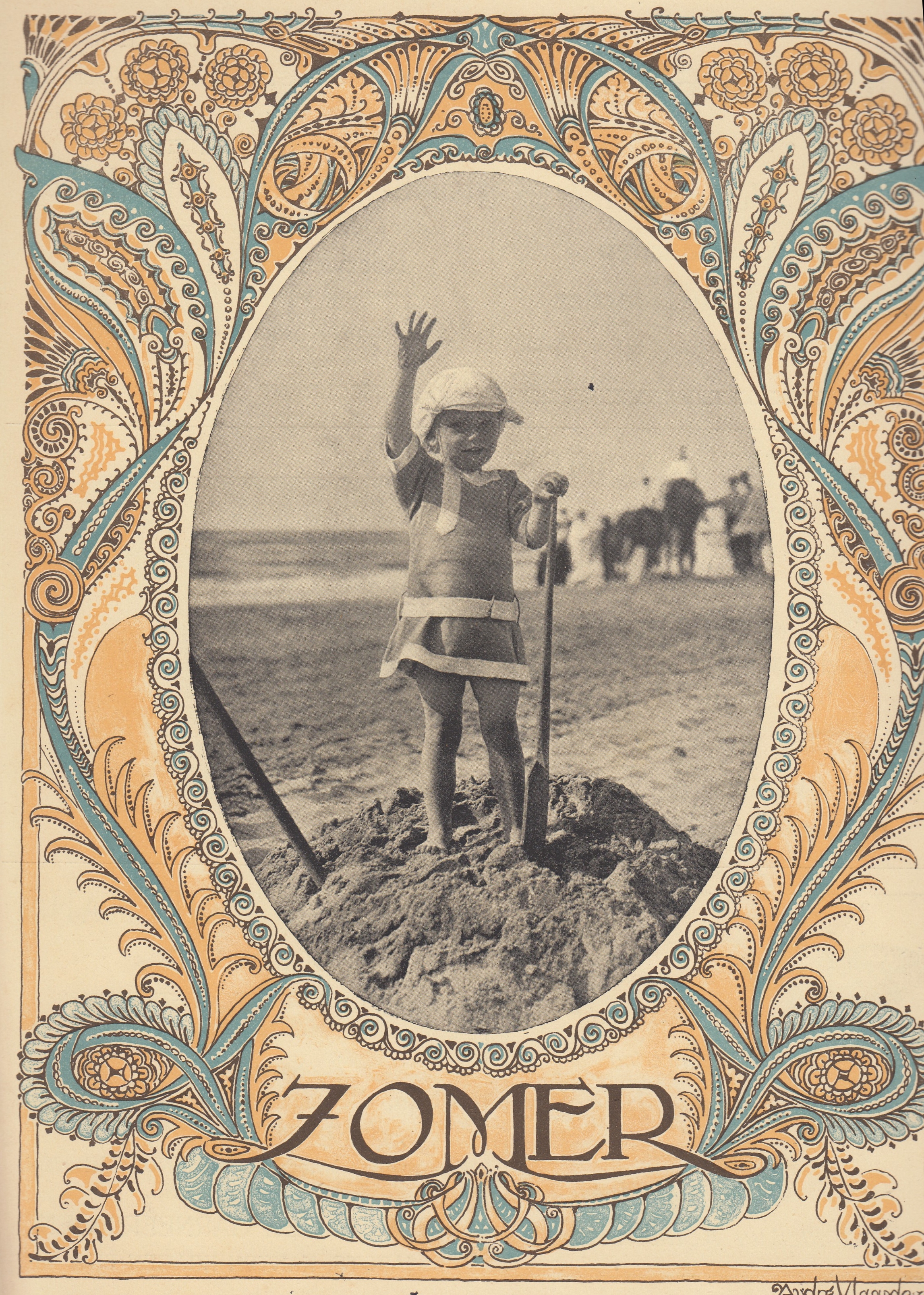 41. VLAANDEREN, André De jaargetijden. Kalender-vloeiboek 1914. Dordrecht, Blussé & Van Braam’s Boekhandel, [1913]. 32 x 24 cm. Genaaid met koord. 20 p. Paginagrote illustraties: meest kinderfoto’s in door André Vlaanderen getekende rijke jugendstil-encadrementen. Kalender op vloeibladen. Met advertenties (alle uit Dordrecht). 1e druk. Omslag roestspikkelig. Vloeibladen licht gebruikt.