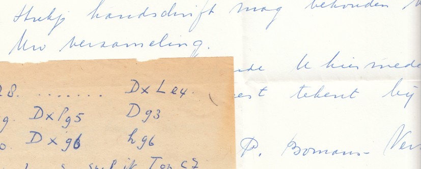 5. BOMANS, Godfried / SCHAKEN Schaakzetten. (Origineel handschrift). 20 x 12 cm. Blaadje uit kladblok met enkele schaakzetten en een opmerking. Alleen recto. 7 regels.