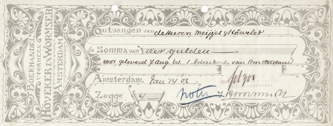 43. WORMSER, Jac. Ph. Nota van Boekhandel voorheen Höveker & Wormser te Amsterdam, Kalverstraat 154. Met een wissel van deze boekhandel in kleiner formaat. 28,5 x 22 cm. Gedrukt in grijs op wit. Versierde kop met jugendstil-kader. Achterop alleen een nieuwekunstkader met liniëring. Gevouwen. Goede staat.