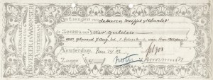 Bijgevoegd een wissel met vergelijkbaar ontwerp (eveneens in lichtgrijs gedrukt) van dezelfde boekhandel Höveker & Wormser (11 x 28 cm), uitgeschreven op naam van Meijes & Höweler (in huishoudelijke artikelen), een betaling voor ‘1 Adresboek van Amsterdam’. Handtekening van uitgever Johan Adam Wormser. Deze is geperforeerd.