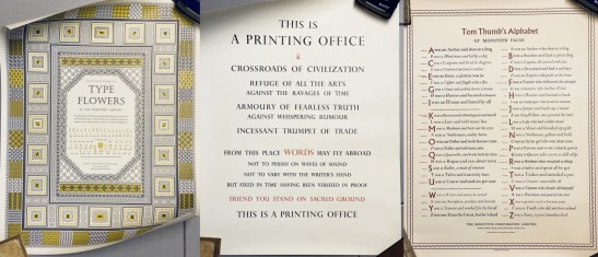 * De Ornament Broadsheets zijn affiches om aan de muur te hangen in een drukkerij of een andere boekminnaarsruimte. Ze werden ontworpen tussen 1955 en 1958, dit is een complete set. De andere posters zijn Tom Thumb’s Alphabet of Monotype Faces, eigenlijk een letterproef, net als How and Why Type Faces Differ met vergelijking in de breedte van verschillende letters, en twee varianten (plus een duplicaat) van This is a Printing Office – Crossroads of Civilization.