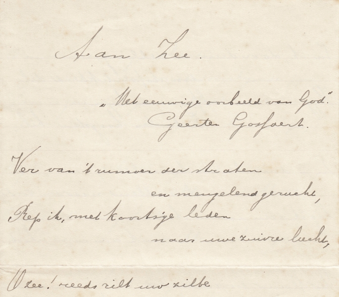 * ‘Loon hun zorgen, loon hun werken/ Alles tot mijn heil besteed,/ ‘k Zei ook, dat het mij zoo smartte,/ Dat ik u verdriet aandeed.’ Vroom gedicht, geschreven voor de Eerste Heilige Communie. Verder zonder enige naam of herkenbaarheid.