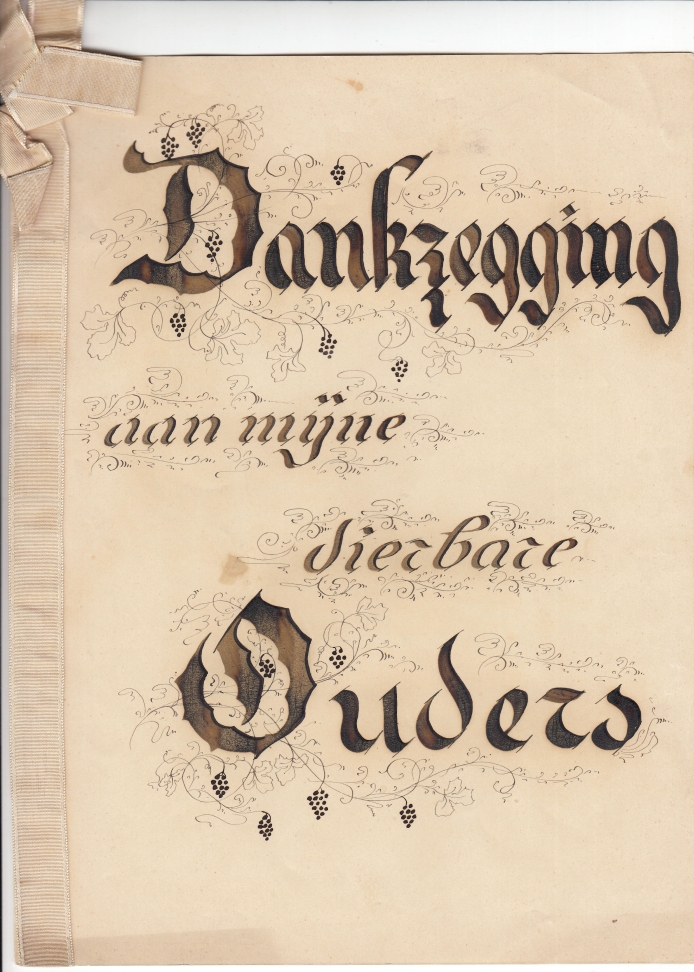 33. NELLIE Dankzegging aan mijne dierbare Ouders. Kalligrafie. 27 x 21 cm. Verbonden met breed zijden lint. 8 p. Sneden verguld. Voorkant met dofgouden sierletters, binnenwerk handgeschreven, met datering 25 April 1906.