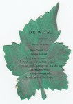 42. WIJNLIED ‘Sinds Noach had/ ontdekt het nat,/ dat wij nu noemen wijn’. Drinklied afgedrukt op een papieren wijnblad. Buitenmaat 12 x 7 cm. Stevig papier, aan één kant met blauw en zilver in wijnbladmotief bedrukt en gestanst. Aan beide kanten staat een lied. Enkele puntjes iets versleten, verder strak en stevig.
