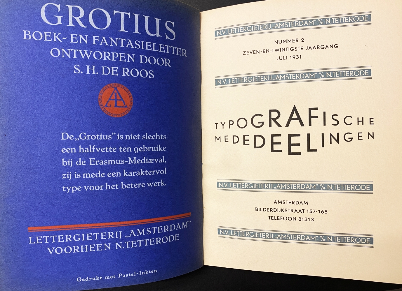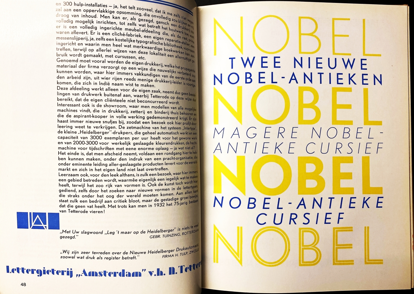 * Het kwartaalblad van de Lettergieterij “Amsterdam”. Aandacht voor de nieuwe letter Nobel en andere letters van S.H. de Roos, verschillende letterproeven zijn erin opgenomen. Opvallend moderne vormgeving met felle kleuren. Veel aantrekkelijke advertenties.